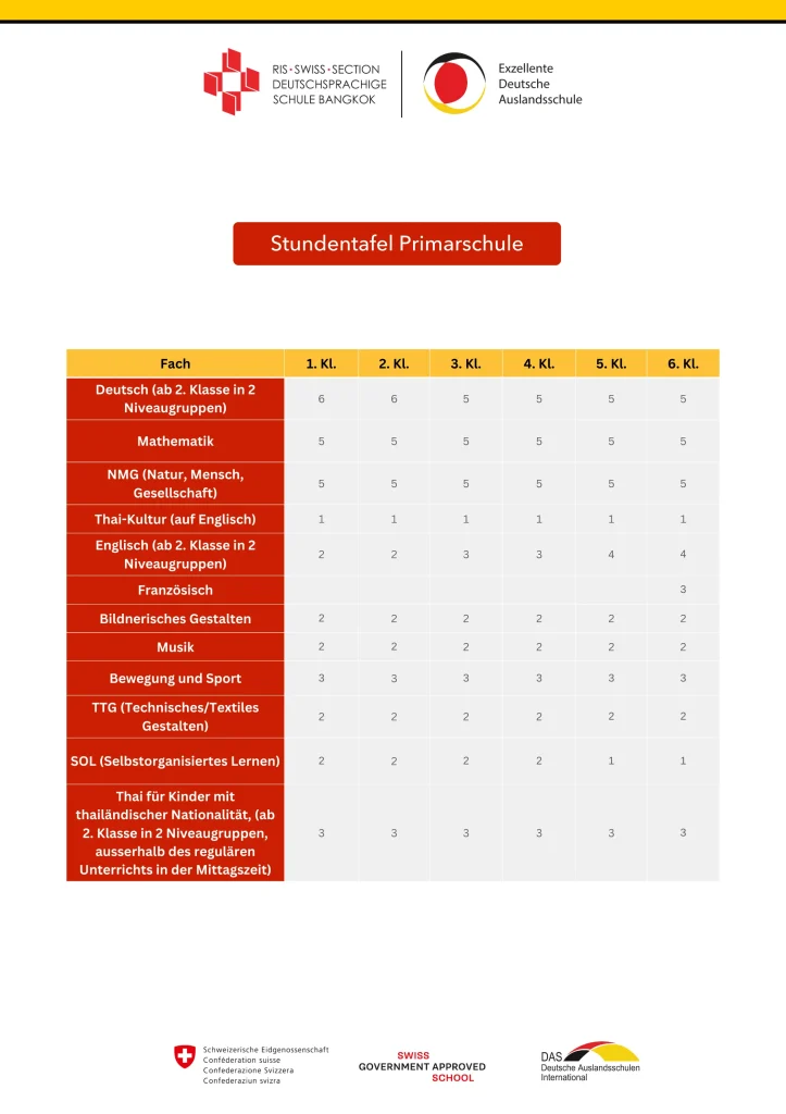 An der Primarschule der RIS Swiss Section bietet der Lehrplan eine umfassende und ansprechende Lernerfahrung. Basierend auf den Schweizer Bildungsstandards und dem Schweizer "Lehrplan 21" liegt der Schwerpunkt auf kompetenzorientiertem Lernen, interdisziplinären Ansätzen, digitaler Kompetenz und der Integration von Sprachfähigkeiten in allen Fächern. Es werden Schlüsselkompetenzen wie kritisches Denken, Kreativität, Kommunikation und Zusammenarbeit gefördert. Sprachvertiefung in Englisch, Deutsch, Thai und Französisch fördert das Sachverständnis und das kulturelle Bewusstsein. Ergänzende Aktivitäten in Kunst, Musik, Sport und MINT (Mathematik, Informatik, Naturwissenschaften und Technik) erweitern den Kernlehrplan und ermöglichen den Schülerinnen und Schülern, ihre Interessen und Talente zu entdecken. Mit dem Fokus auf die Entwicklung wesentlicher Fähigkeiten wie kritischem Denken, Kreativität und Kommunikation bereitet unser Lehrplan die Schülerinnen und Schüler auf den Erfolg in einer globalisierten Welt vor.